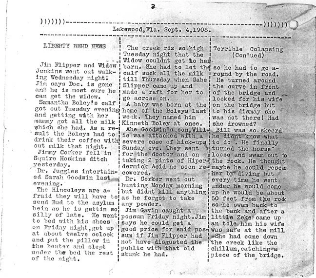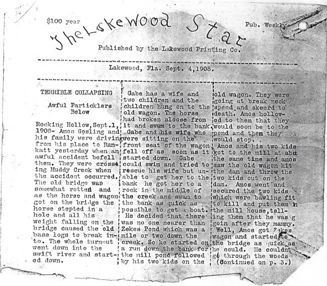 Rocking Hollow, Sept.1, 1908- Amos Gosling and his family were driving from his place to Ramkatt yesterday when an awful accident befell them. They were crossing Muddy Creek when the accident occurred. The old bridge was somewhat rotten and as the horse and wagon got on the bridge the horse stepted in a hole and all his weight falling on the bridge caused the old base logs to break into. The whole turnout went down into the swift river and started down. Gabe has a wife and two children and the children hung on to the old wagon. The horse had broken aloose from it and swum to the bank.