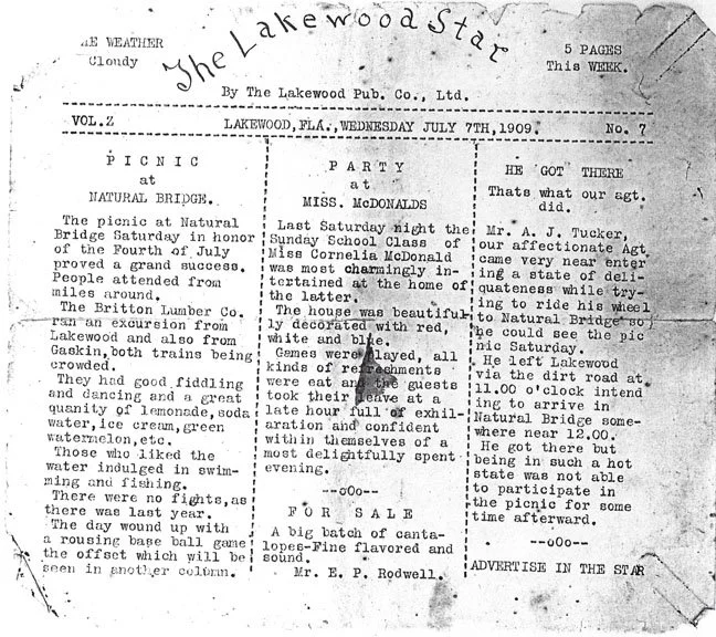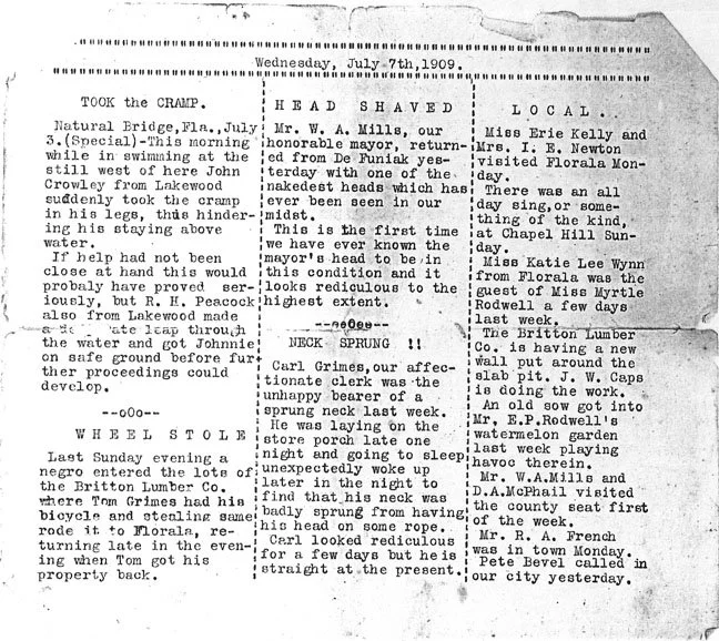 Natural Bridge, Fla., July 3 (Special) - This morning while in swimming at the still west of here John Crowley from Lakewood suddenly took the cramp in his legs, thus hindering his staying above water.