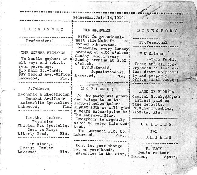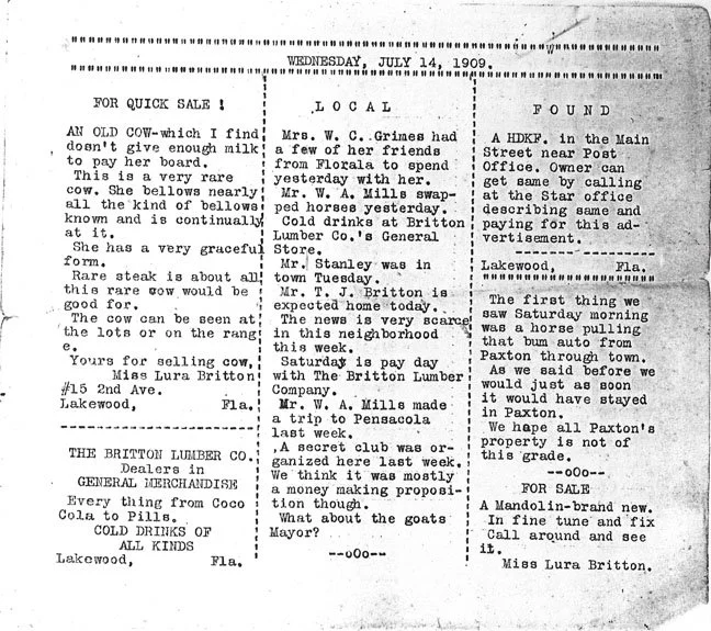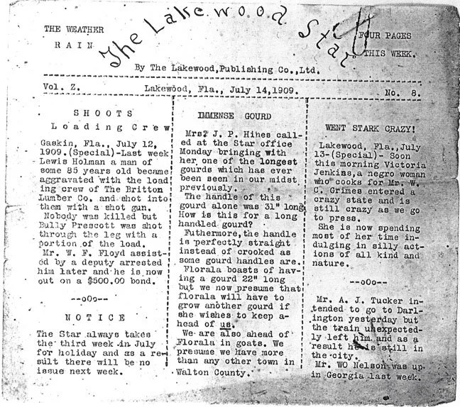 Gaskin, Fla., July 12, 1909. (Special) -Last week Lewis Holman a man of some 85 years old became aggravated with the loading crew of The Britton Lumber Co. and shot into them with a shot gun.