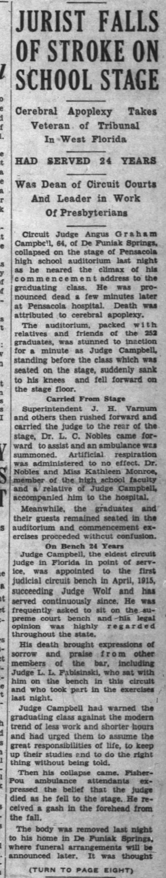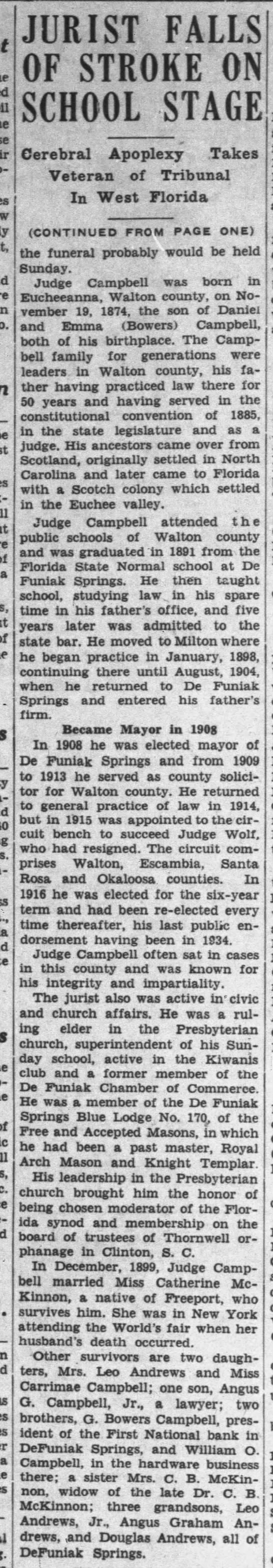 Circuit Judge Angus Graham Campbell, 64, of De Funiak Springs, collapsed on the stage of Pensacola high school auditorium last night [June 16, 1939] as he neared the climax of his commencement address to the graduating class. He was pronounced dead a few minutes later at Pensacola hospital. Death was attributed to cerebral apoplexy.