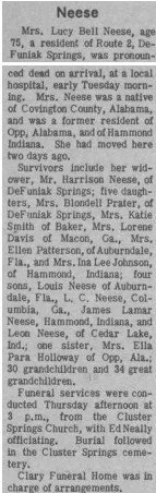 Mrs. Lucy Bell Neese, age 75, a resident of Route 2, DeFuniak Springs, was pronounced dead on arrival, at a local hospital, early Tuesday morning [April 20, 1971]. Mrs. Neese was a native of Covington County, Alabama, and was a former resident of Opp, Alabama, and of Hammond Indiana. She had moved here two days ago.
