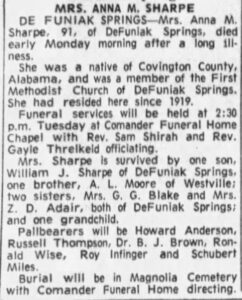 Mrs. Sharpe is survived by one son, William J. Sharpe of DeFuniak Springs; one brother, A. L. Moore of Westville; two sisters, Mrs. G. G. Blake and Mrs. Z. D. Adair, both of DeFuniak Springs; and one grandchild.