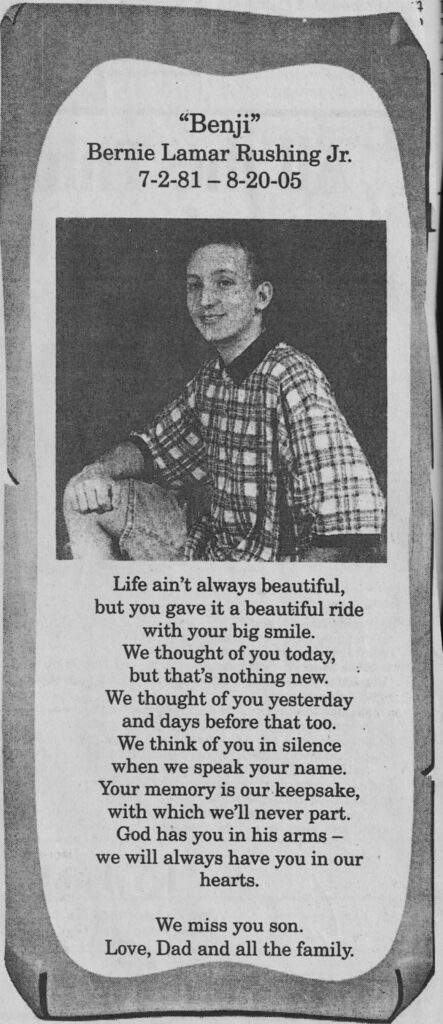 Bernie Lamar Rushing, Jr. December 5, 2020 admin His gravestone lists his birth date as June 2, 1981. [Source: The DeFuniak Springs Herald, August 24, 2006] [Burial: New Ponce de Leon Cemetery, Ponce de Leon]