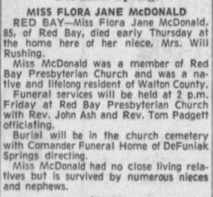 Miss McDonald was a member of Red Bay Presbyterian Church and was a native and lifelong resident of Walton County.