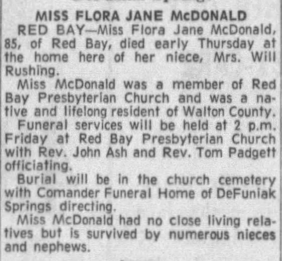 Miss Flora Jane McDonald, 85, of Red Bay, died early Thursday at the home here of her niece, Mrs. Will Rushing.