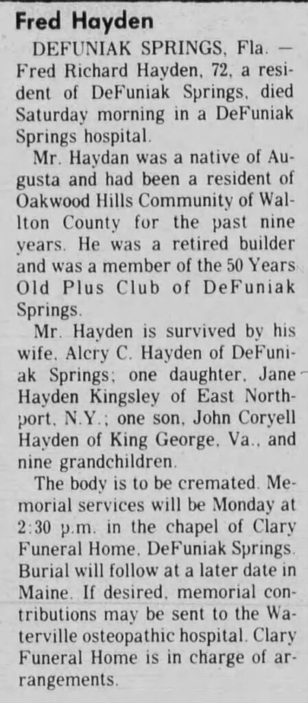 Mr. Haydan was a native of Augusta [Maine] and had been a resident of Oakwood Hills Community of Wal-lton County for the past nine years. He was a retired builder and was a member of the 50 Years Old Plus Club of DeFuniak Springs.