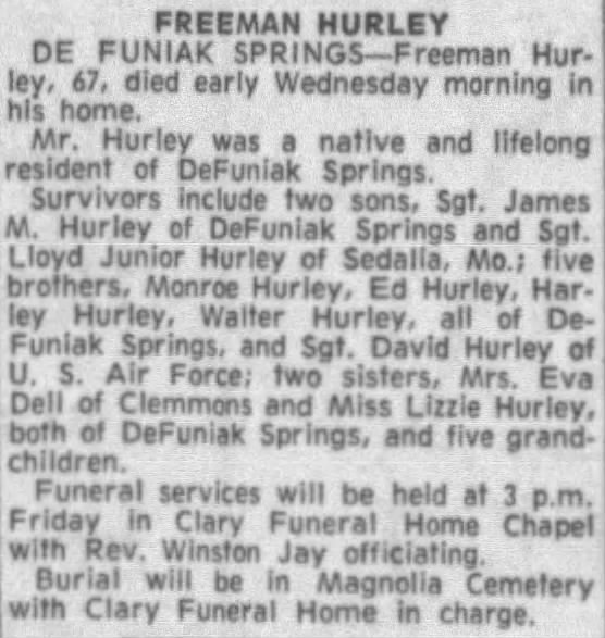 Survivors include two sons, Sgt. James M. Hurley of DeFuniak Springs and Sgt. Lloyd Junior Hurley of Sedalia, Mo.; five brothers, Monroe Hurley, Ed Hurley, Harley Hurley, Walter Hurley, all of DeFuniak Springs, and Sgt. David Hurley of U. S. Air Force; two sisters, Mrs. Eva Dell of Clemmons and Miss Lizzie Hurley, both of DeFuniak Springs, and five grandchildren.