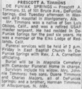 Mr. Timmons was a native of San Luis Obispo, Calif., and was a retired USAF master sergeant. He had resided in DeFuniak Springs for the past six years. He was a member of the Elks Lodge of Redlands, Calif.